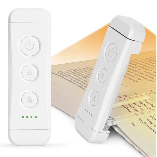 The Glocusent USB Rechargeable Book Light is a compact, clip-on LED light with 3 amber colors and 5 brightness levels, perfect for reading in bed or on the go.