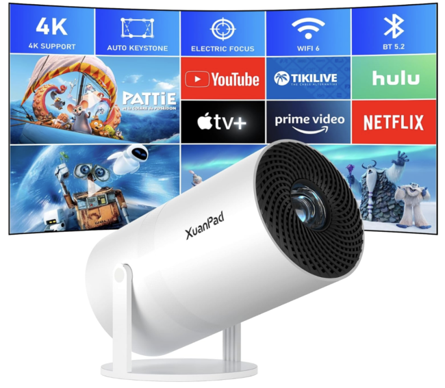 XuanPad Mini Projector offers electric focus, 4K support, WiFi 6, Bluetooth 5.2, and a 180° stand for a seamless, big-screen experience anywhere!